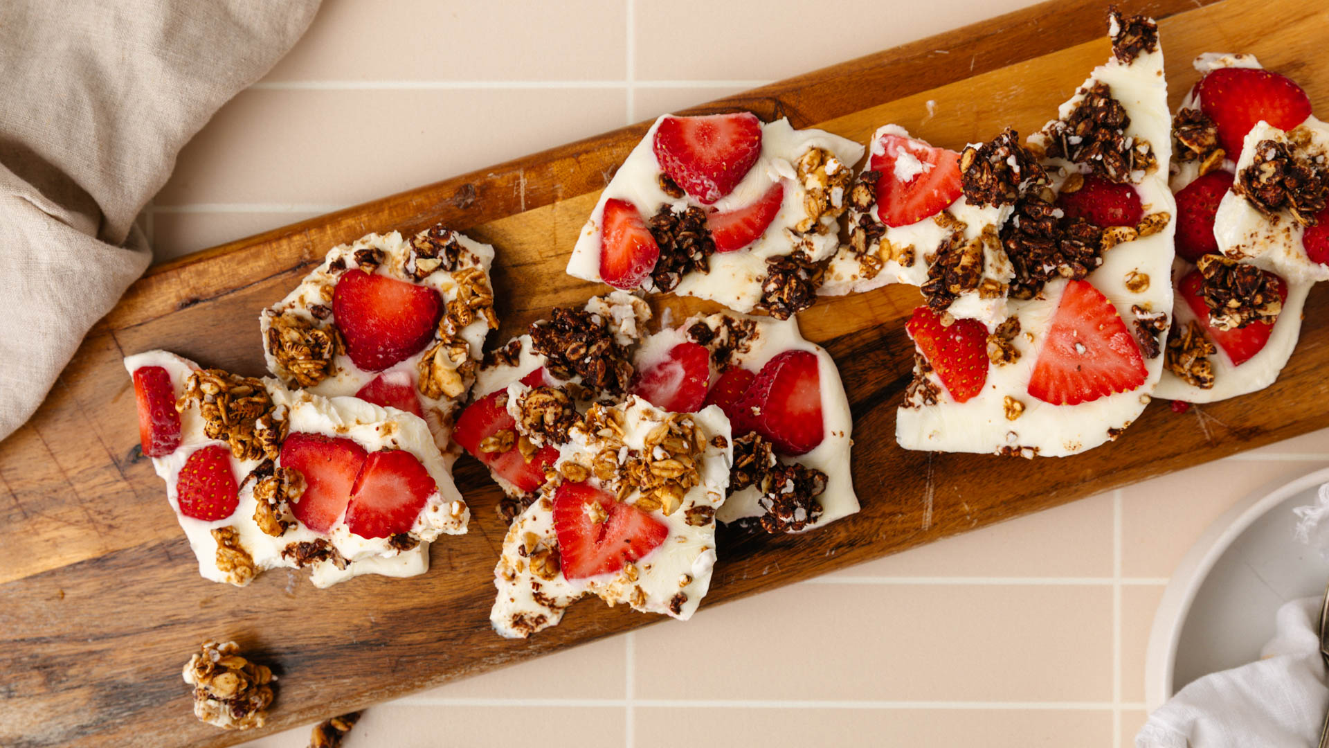 - Scatter strawberries and granola bites evenly over the yoghurt, pressing lightly into the yoghurt so they stick.