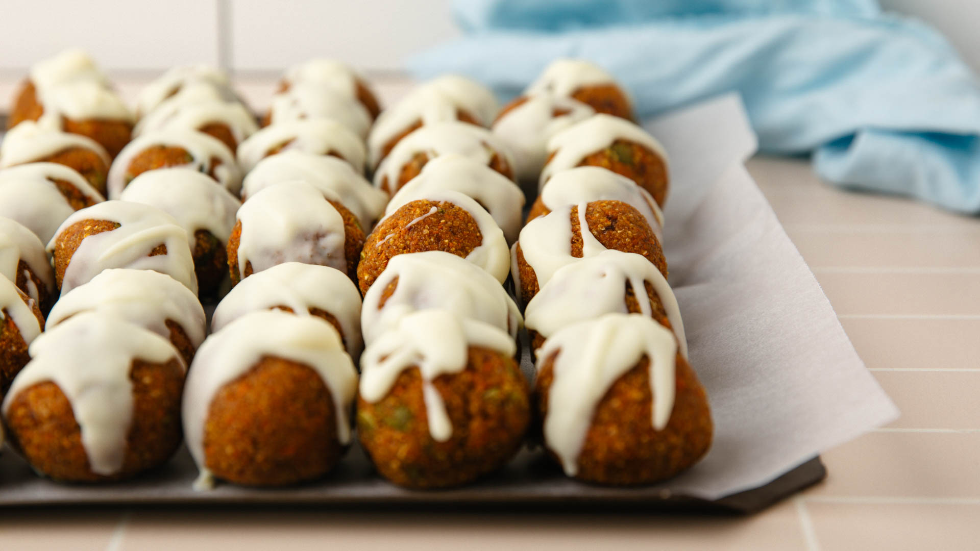 - Dip each bliss ball into the glaze (or drizzle over the top) and return to the lined tray.