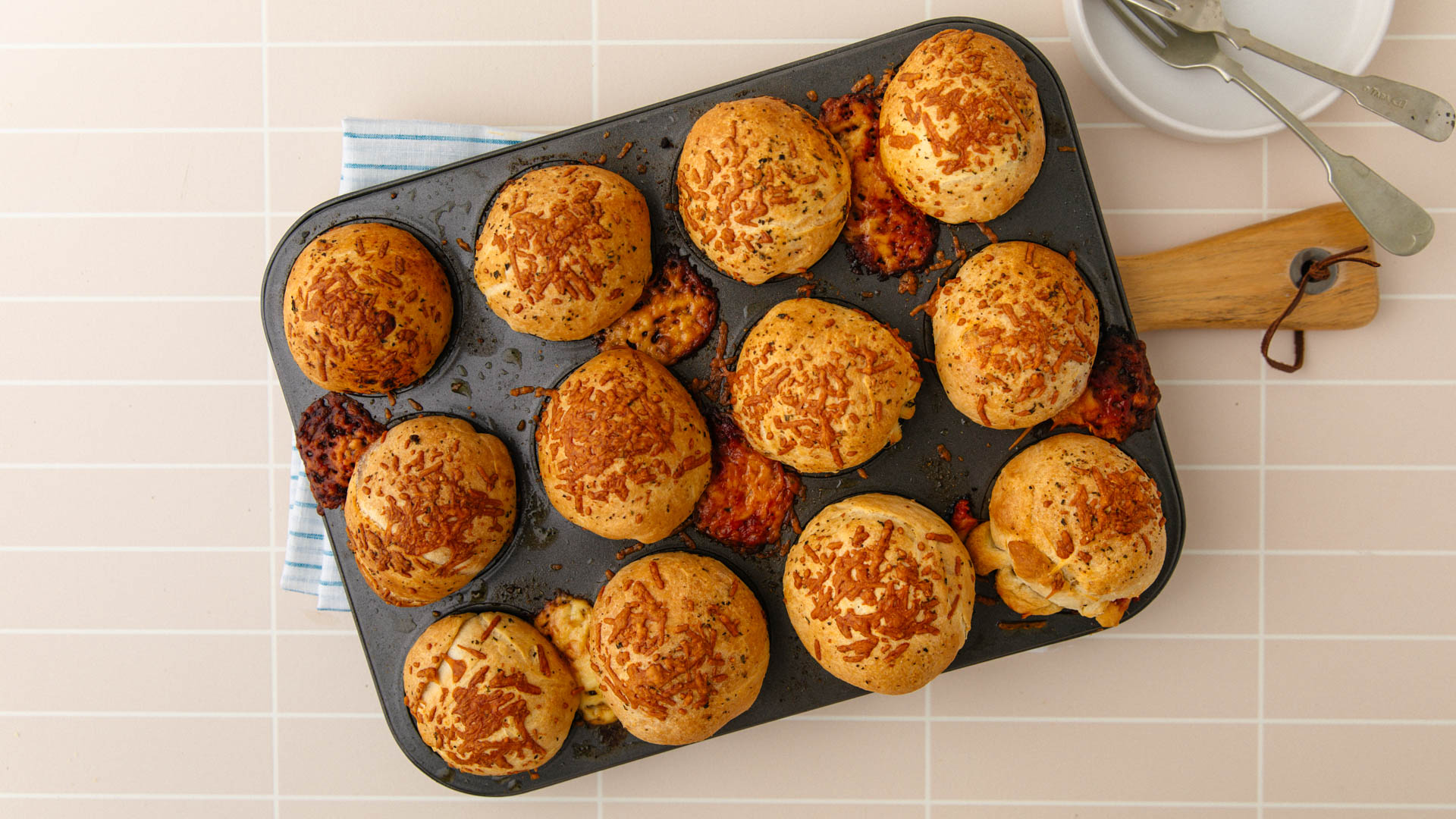 - Place pizza pockets, seam-side down, into the muffin tin. Brush or spoon the melted butter mixture onto the pizza pockets and sprinkle over parmesan cheese.