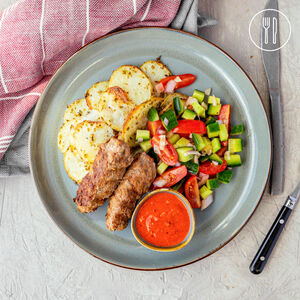 Cevapi with Capsicum Dip and Roasted Potatoes