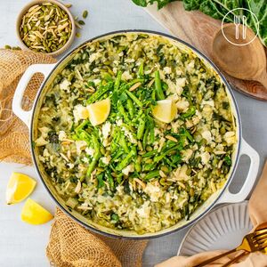 Baked Green Risotto with Crumbled Feta and Peas