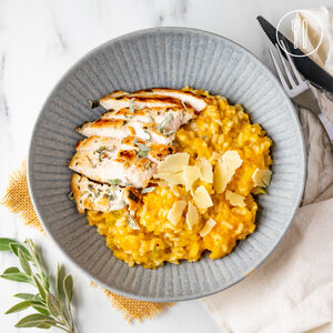 Cheesy Pumpkin Risotto with Sage Chicken
