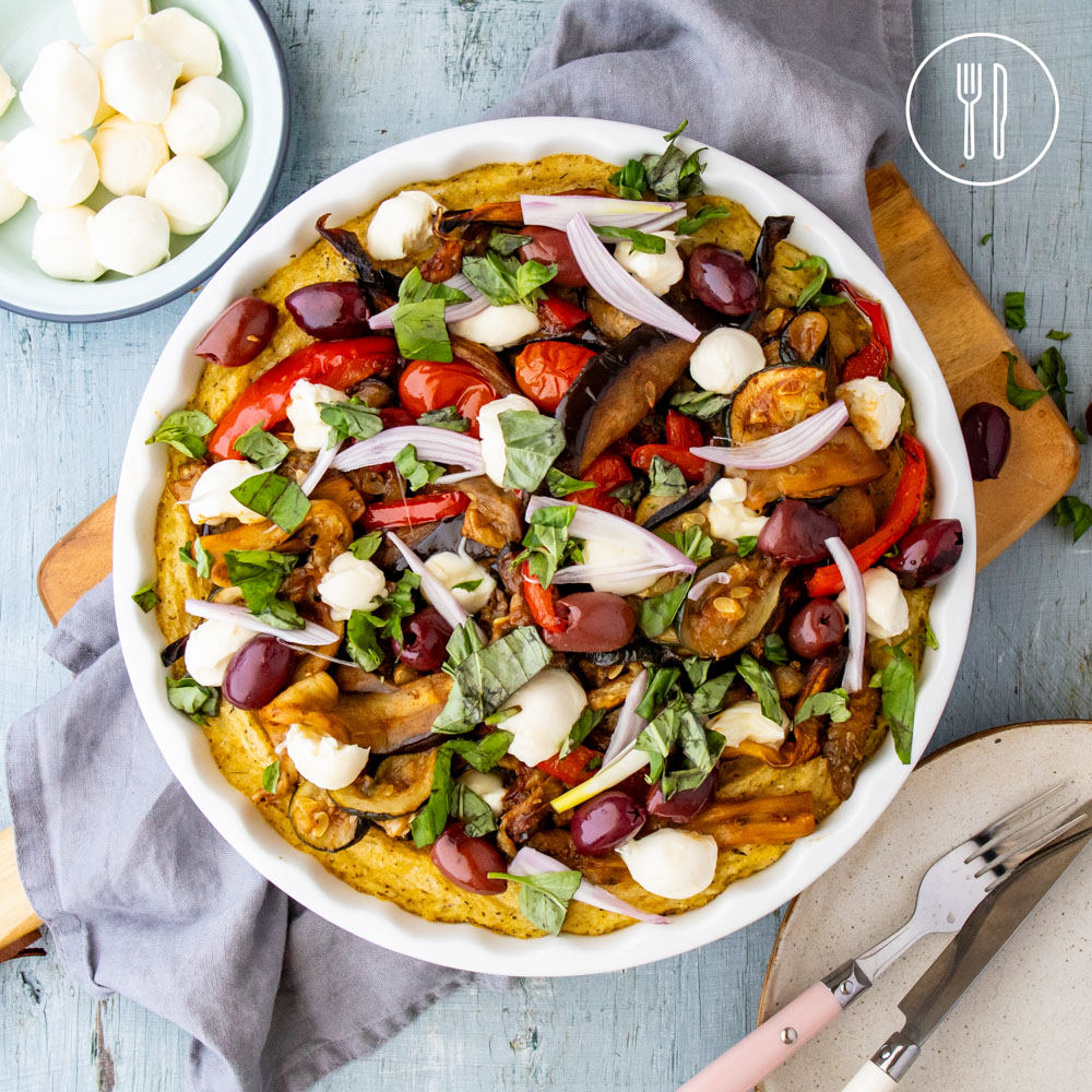 A naturally gluten-free tart base, made from flavourful polenta, baked to created a crispy exterior, topped with roasted antipasto vegetables, Kalamata olives, bocconcini cheese and fresh basil.