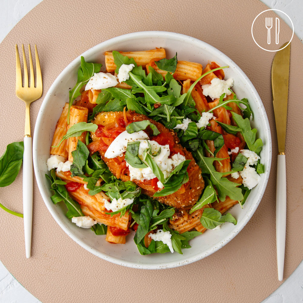 Crispy panko-crumbed chicken parmigiana meets fiery arrabbiata pasta, with rigatoni tossed in spicy tomato sauce and topped with golden chicken breast, creamy mozzarella, basil and rocket.