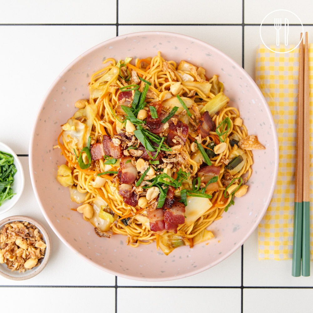 Tender egg noodles are tossed with crispy bacon, colourful vegetables and a glossy stir-fry sauce, then finished with crunchy shallots and peanuts for an easy, crowd-pleasing family dinner.