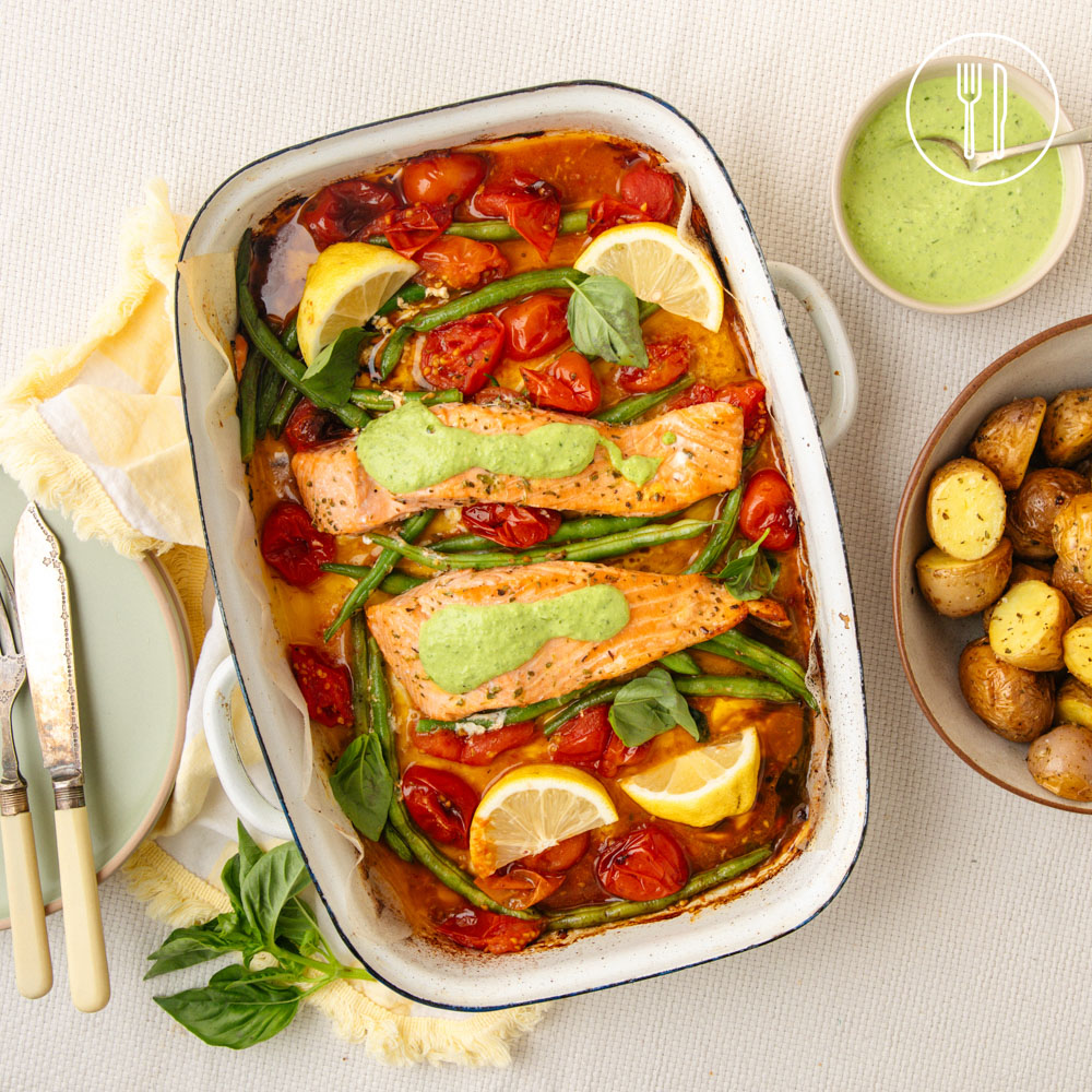 almond meal, salmon fillets, green beans, basil, cherry tomatoes, lemon, baby potatoes
