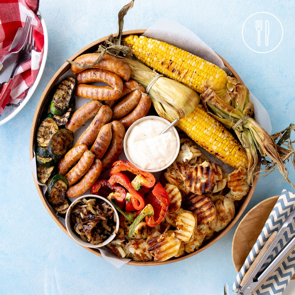 Alfresco dining at it’s family-friendly finest! Beef chipolata sausages, barbecued with a rainbow of veggies and smashed baby potatoes, served with caramelised onions and creamy dipping sauce.
