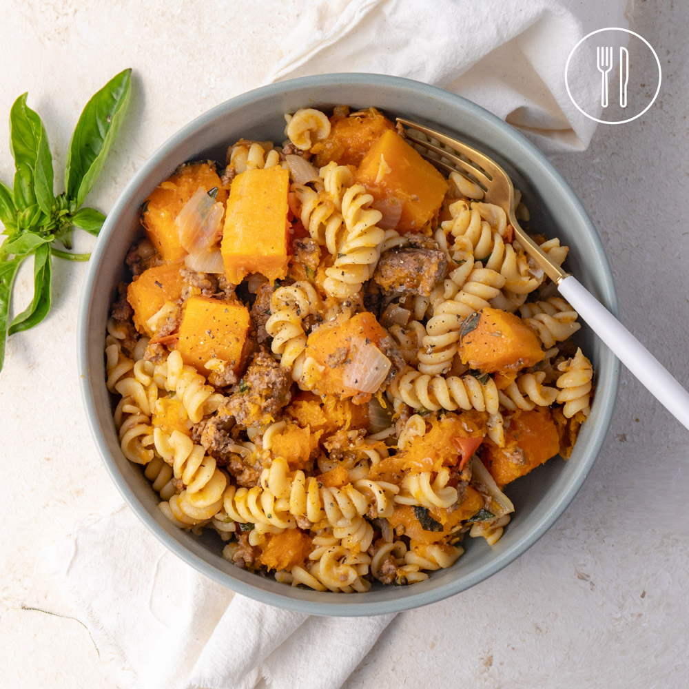 Tender short pasta combined with beef mince and butternut pumpkin, with fresh tomato and aromatic basil.