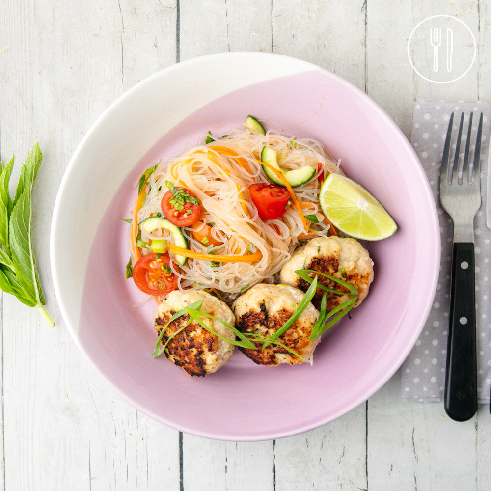 Deliciously fragrant homemade fish cakes, flavoured with kaffir lime and grilled until golden, served with a fresh noodle salad of cucumber, cherry tomatoes, carrot, and fresh herbs.