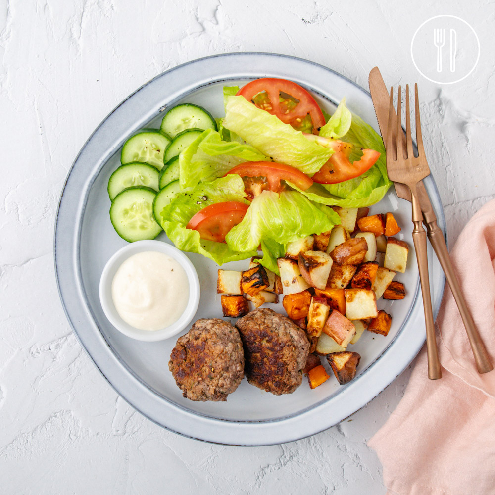 Beef mince patties with golden cubes of roast potatoes, served with a fresh salad and aioli for dipping.