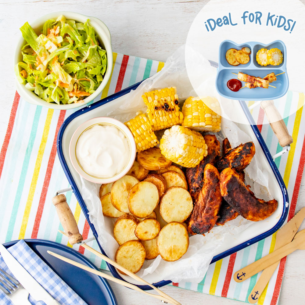 chicken tenderloins, peri peri spice mix, aioli, carrot, corn cob, baby cos lettuce, medium potatoes