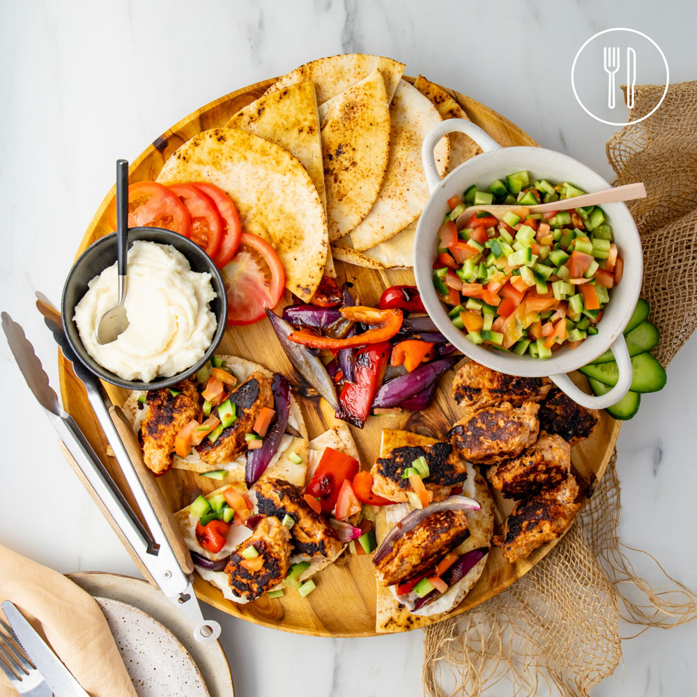 Bring everyone outside and cook this share platter on the BBQ! Chicken koftas spiced with a fragrant spice mix, capsicum and onion, served with barbecued veggies, luscious skordalia, salsa and Lebanese flat breads.