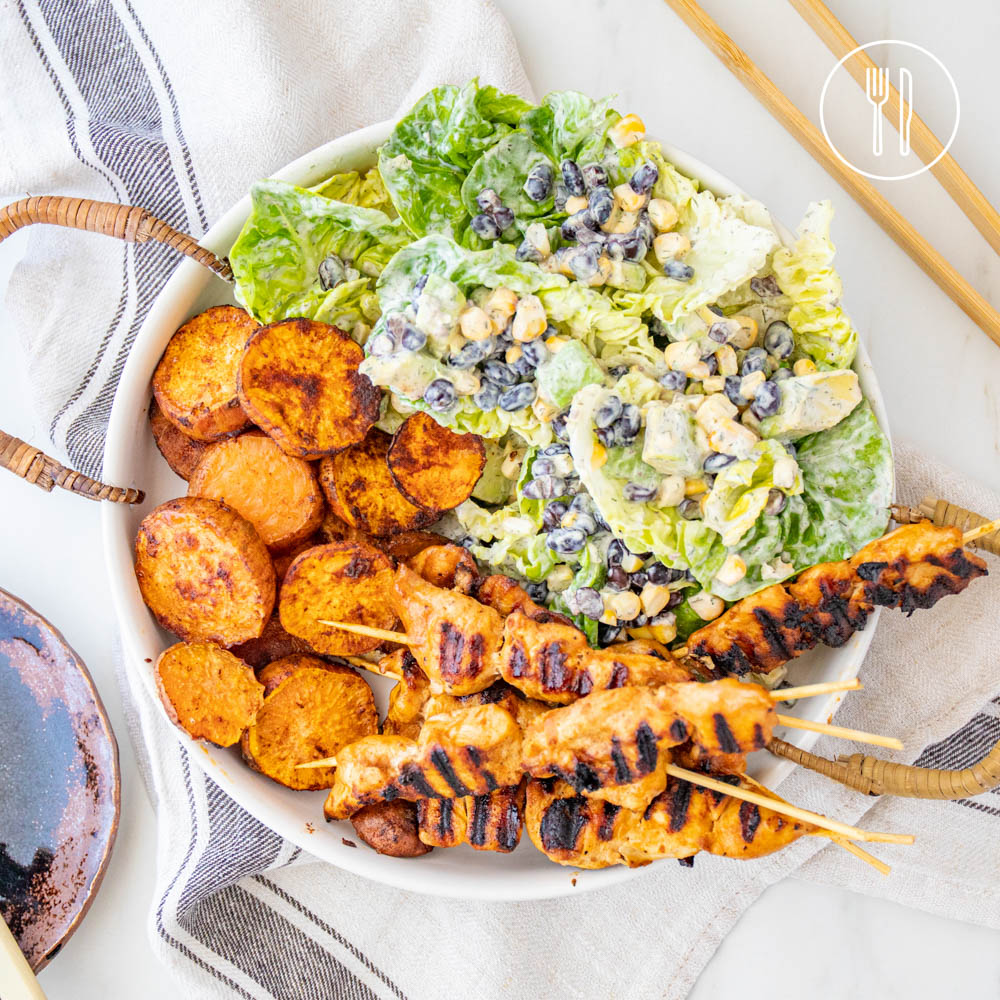 Delicious BBQ chicken skewers paired with a fresh salad of charred corn, black beans and avocado, served with smoky roasted veg for a hearty, flavour-packed meal.