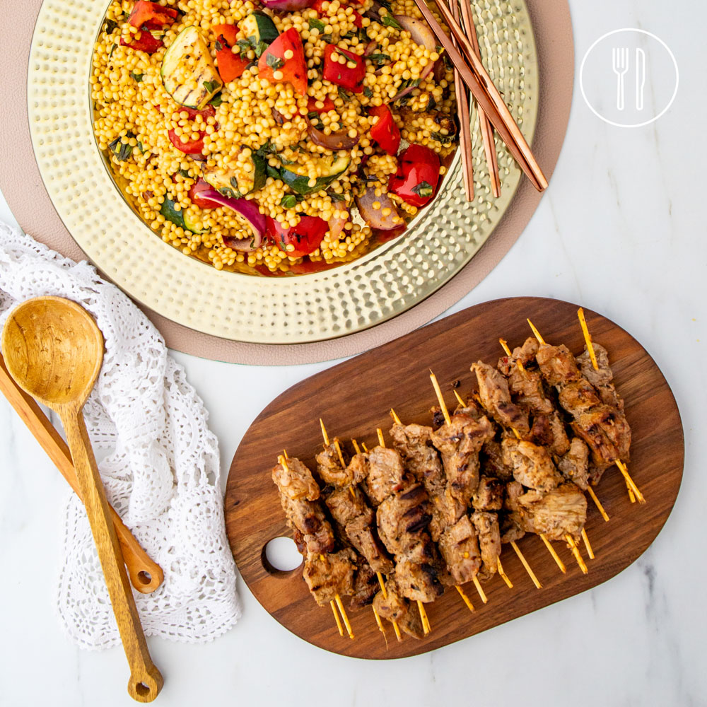 BBQ Lamb Skewers with Harissa Pearl Couscous Salad