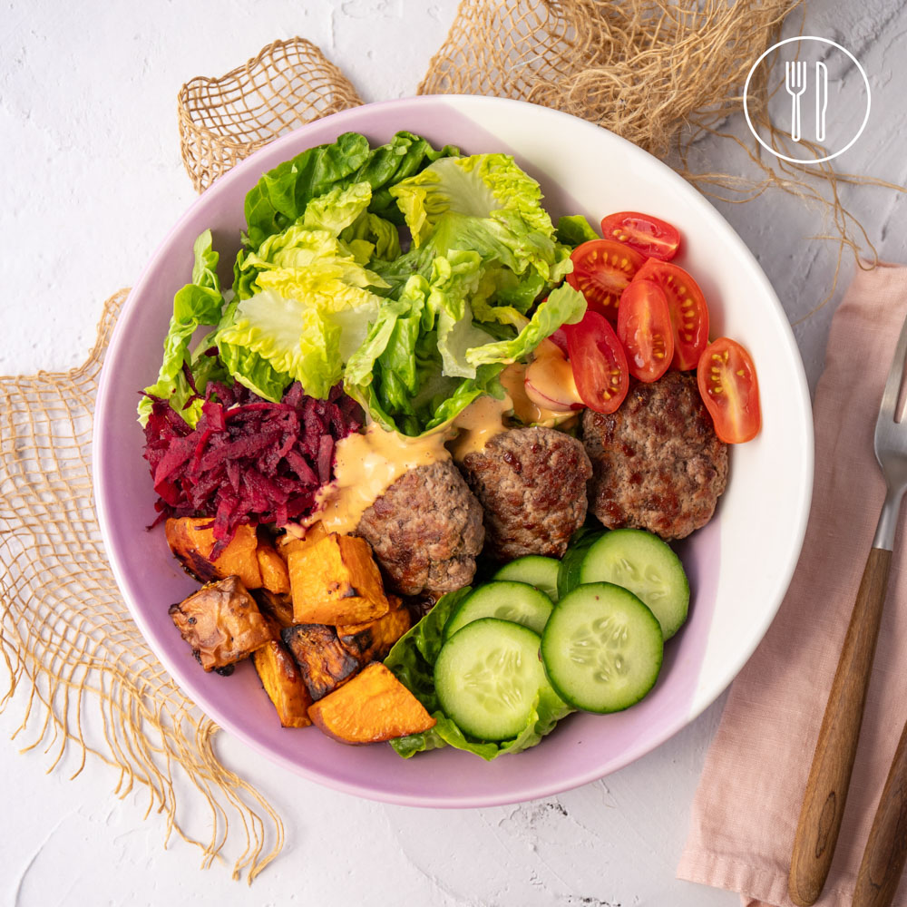 Beef patties served on top a bed of fresh salad ingredients, including crisp lettuce, juicy tomatoes, and grated beetroot. Complemented by roasted sweet potato wedges