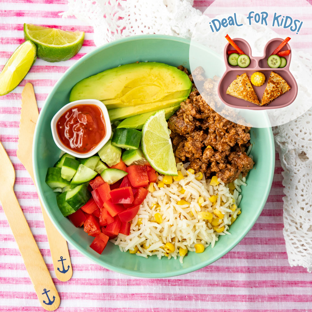 Mexican beef mince cooked in salsa and served with crispy corn rice, creamy avocado and crunchy vegetables.