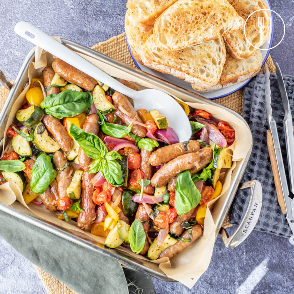 A no-fuss dinner that’s full of flavour! Beef chipolatas with oven-baked balsamic vegetables finished with fresh basil and served with crunchy garlic ciabatta bread.