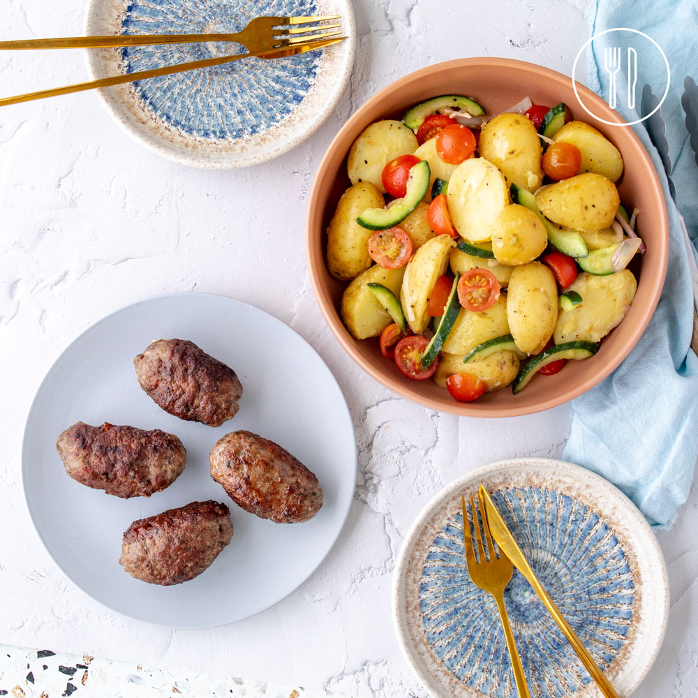 Juicy beef koftas, paired with a fresh and vibrant Mediterranean baby potato salad, with crisp cucumber, cherry tomatoes, and tangy shallot, all tossed in a light vinaigrette.
