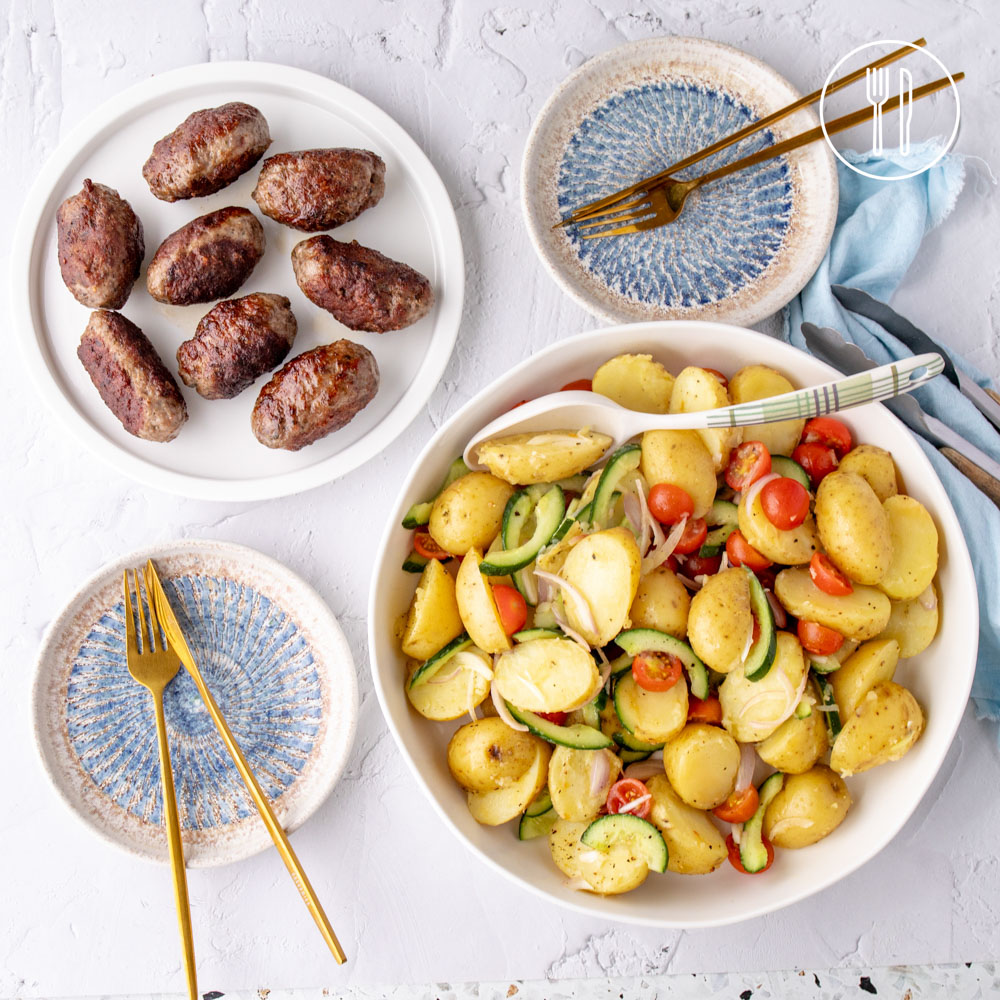 Juicy beef koftas, paired with a fresh and vibrant Mediterranean baby potato salad, with crisp cucumber, cherry tomatoes, and tangy shallot, all tossed in a light vinaigrette.