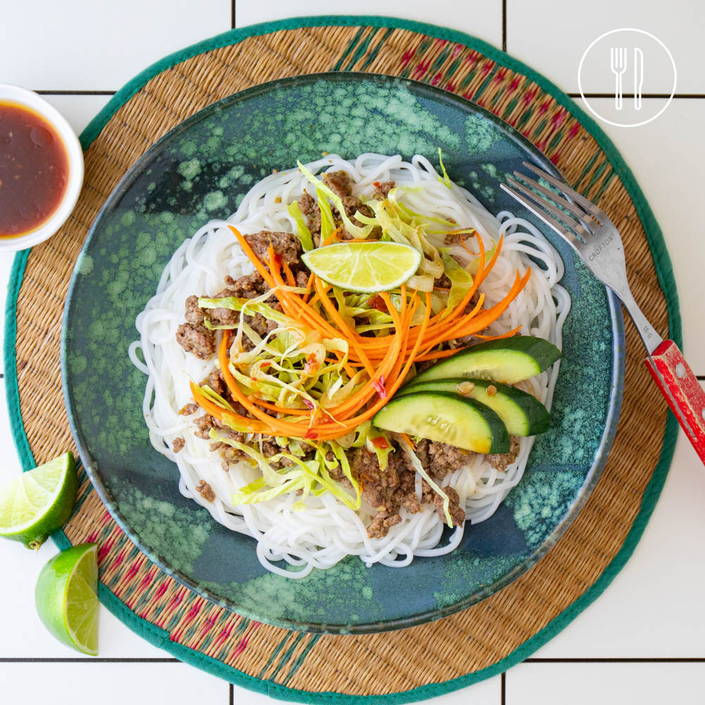 beef mince, rice vermicelli noodles, carrot, Lebanese cucumber, baby cos lettuce, lime