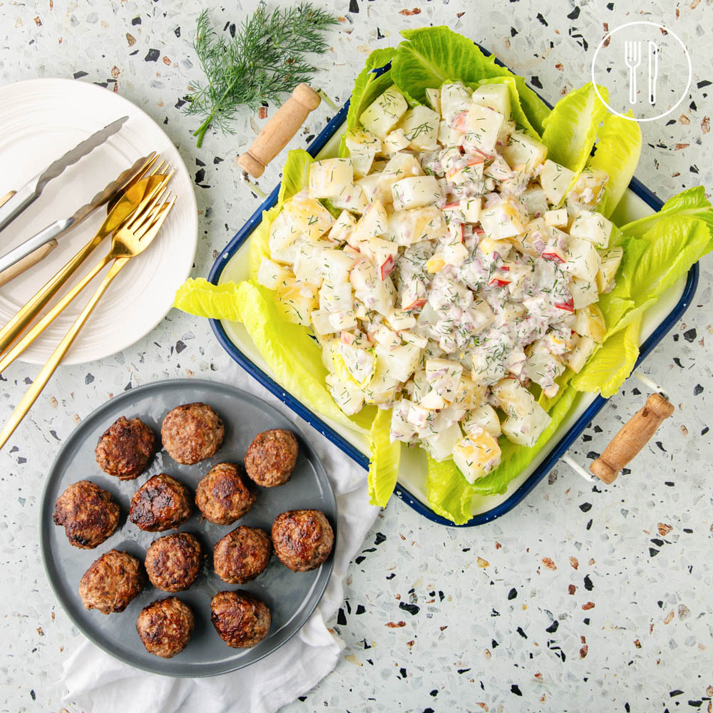 Juicy, pan-seared beef meatballs, served with a creamy dill potato and apple salad layered over crisp cos lettuce.