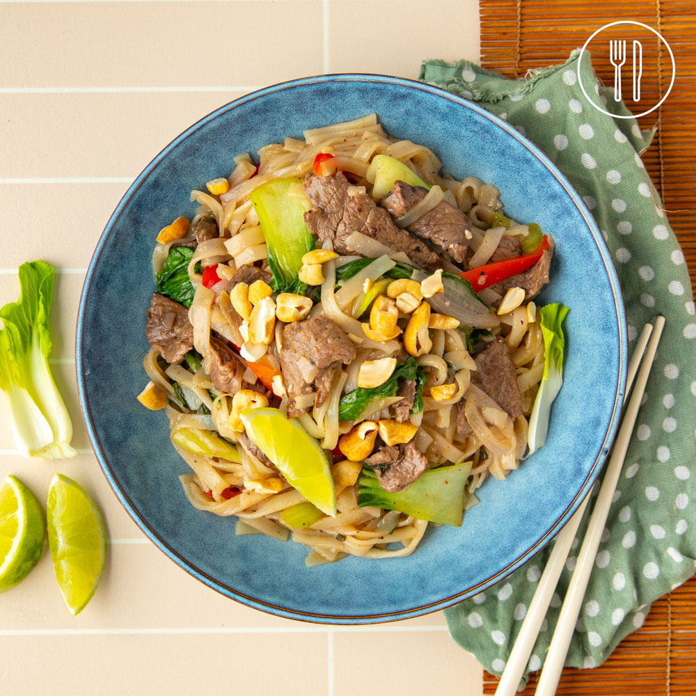 Tender beef, rice noodles and Asian greens are stir-fried in a rich, savoury-sweet sauce, then finished with lime and cashews for a comforting Thai-inspired favourite.