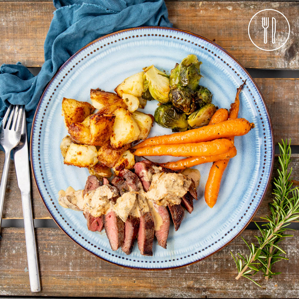 Beef steaks cooked to your liking, served with rosemary roasted vegetables and a earthy, creamy, flavourful wild mushroom sauce.