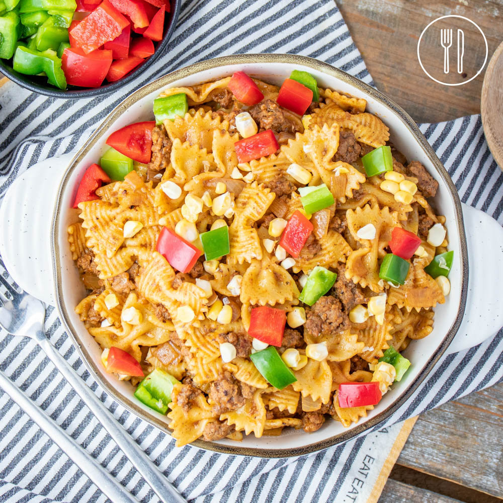 beef mince, salsa, short pasta, green capsicum, red capsicum, corn cob, brown onion