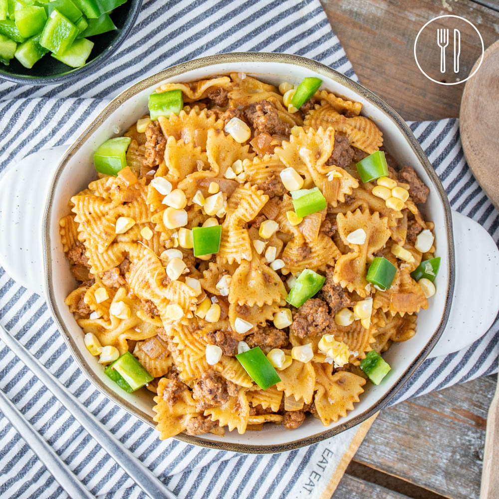 Mexican beef mince tossed through pasta with a delicious tomato salsa and finished with a colourful fresh topping!