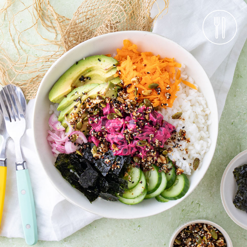 Time saving pre-cooked beetroot diced and tossed with vegan mayonnaise, served over sticky sushi rice, with fresh toppings and torn seaweed sheets, topped with peanut, mixed seed and chilli cluster mix.