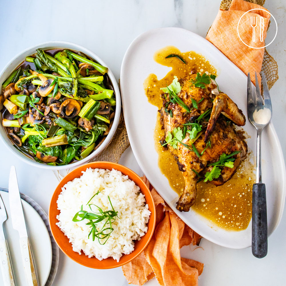 Split chicken, braised in a beautiful aromatic, spiced soy sauce broth, served with sticky rice, luscious green stir fry and braising liquid to drizzle over everything on your plate!