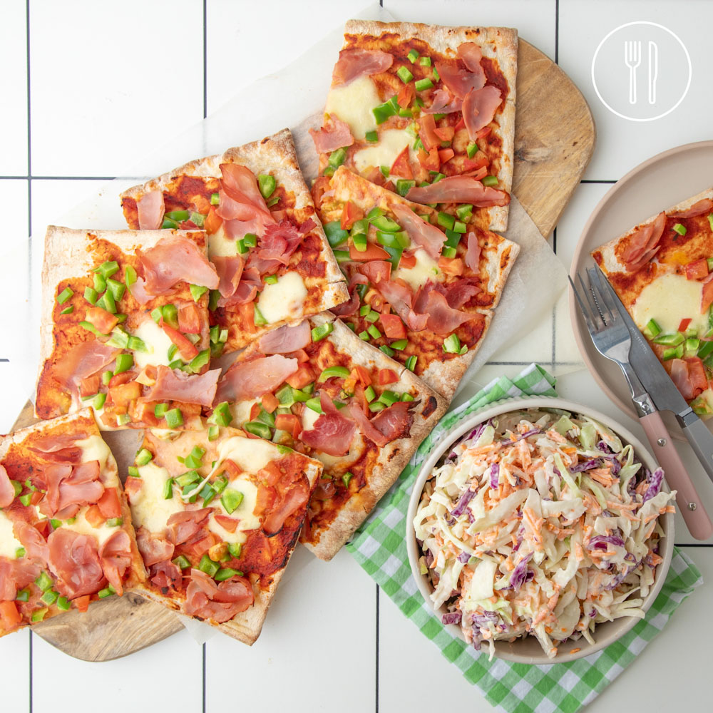Family style pizzas using Planet St Bakery’s crispy thin bases, topped with ham, capsicum and tomato, served alongside a creamy coleslaw.