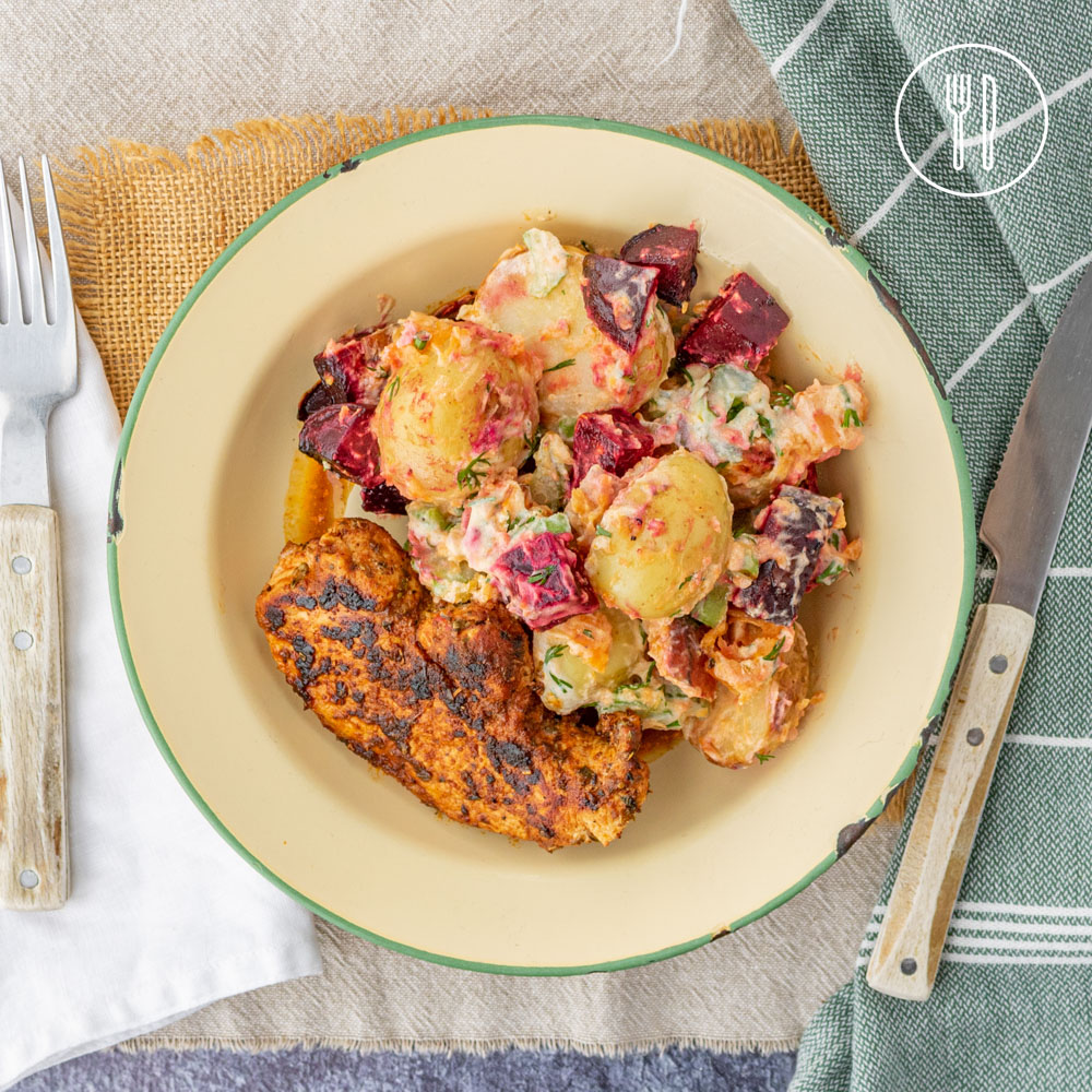 natural yoghurt, free - range pork steaks, dill, celery stick, beetroot, medium potatoes, sweet potatoes