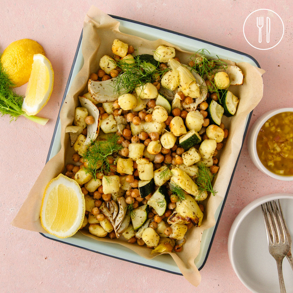 A vibrant Mediterranean-style tray bake loaded with crispy gnocchi and roasted veggies, this dish is brilliantly simple, just spread everything on a tray, pop it in the oven, and the hard work is done!