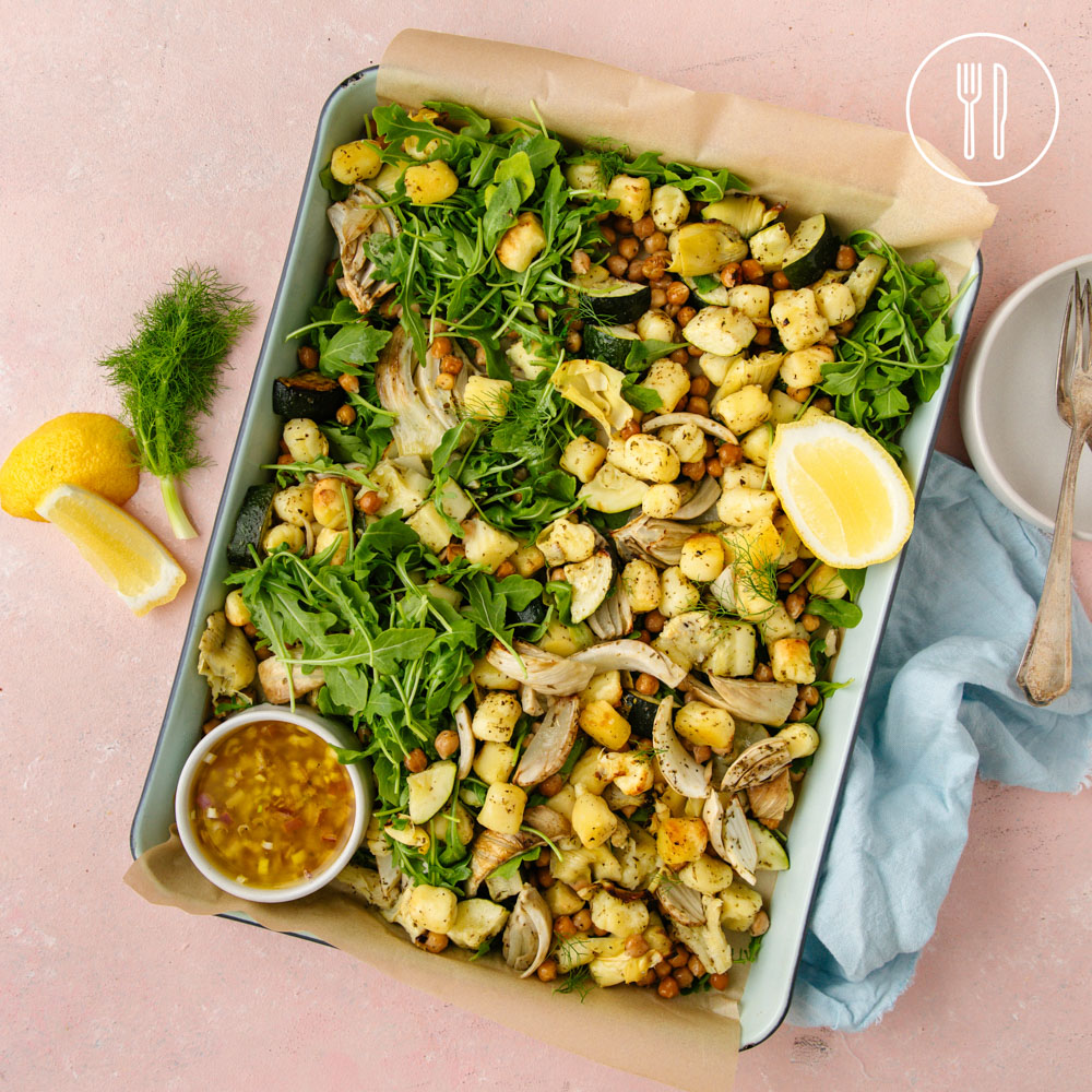 artichoke hearts tinned, tinned chickpeas, gnocchi, rocket leaves, fennel, lemon, shallot, zucchini, garlic clove