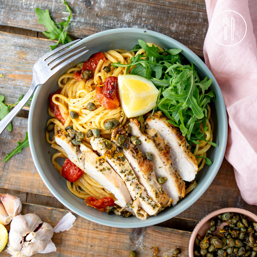chicken breast fillets (skin on), capers, long pasta, butter, rocket leaves, cherry tomatoes, garlic bulb, lemon