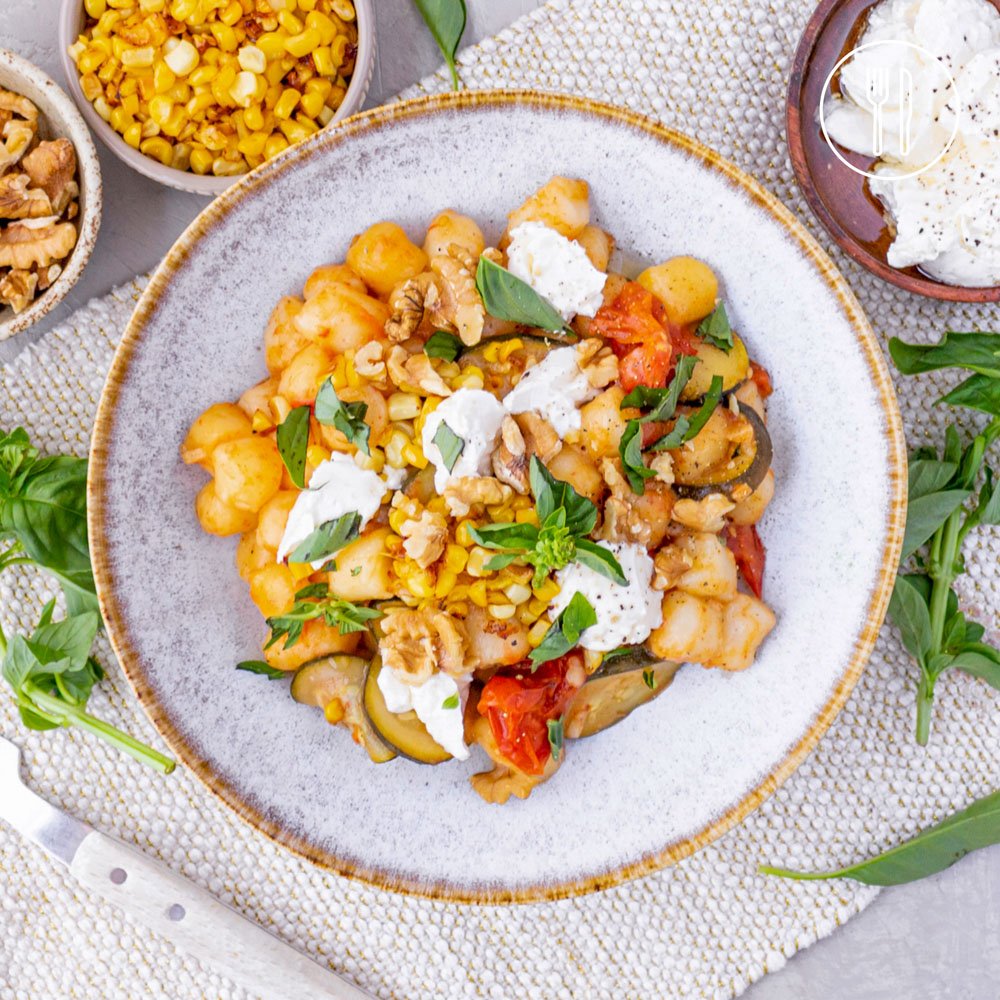 Roasted tomatoes, sweet corn and zucchini tossed through fresh gnocchi and served with whipped feta, fresh basil leaves and walnuts.