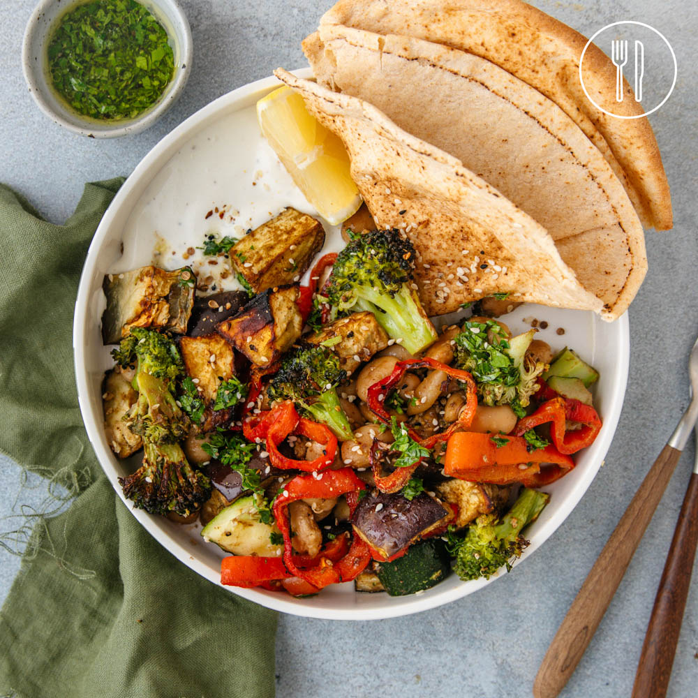 Warmly spiced roasted vegetable medley with creamy butterbeans, dressed with a herb and lemon vinaigrette, whipped feta cheese and warm pita triangles for dipping.