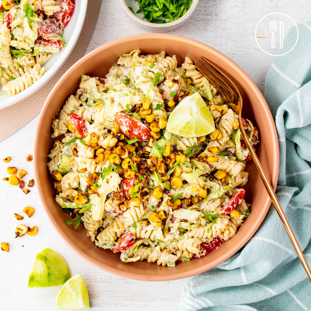 Quick and easy? Yes, thanks! This pasta boasts corn kernels charred with a family-friendly Cajun spice mix, tossed through lime and chive ricotta dressing with avocado, cherry tomatoes and crunchy lettuce.