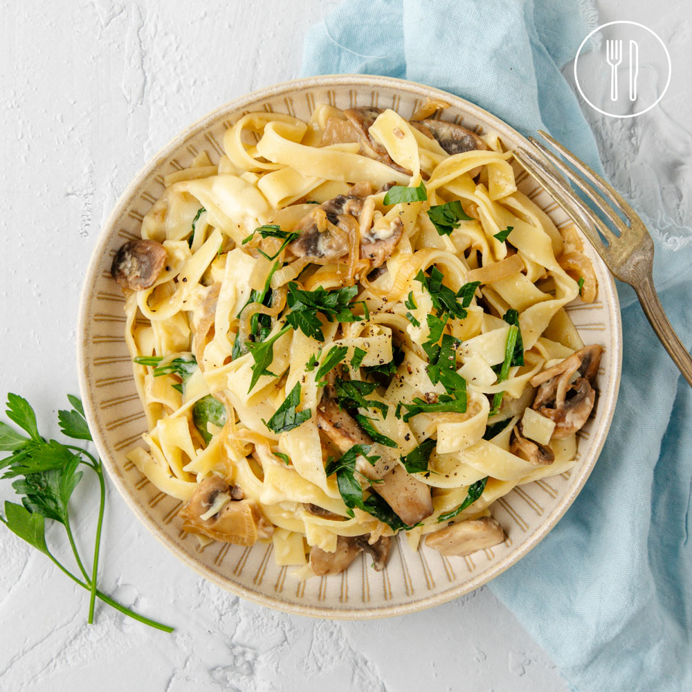 A rich and comforting pasta tossed with sweet caramelised onions, golden mushrooms, and baby spinach, finished with a cheddar sauce and fresh parsley.