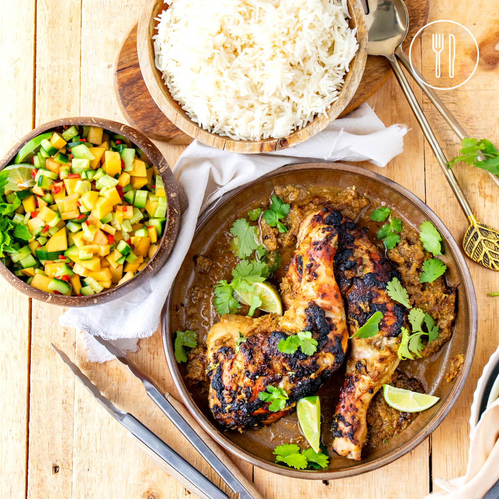 Chicken marylands roasted until charred, in a homemade marinade with flavours of cumin and lime, served with a fresh stone fruit salsa and rice.
