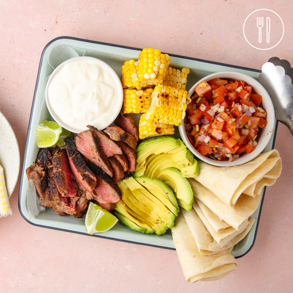 beef steaks, wheat wraps, sour cream, avocado, corn cob, lime, shallot, tomato