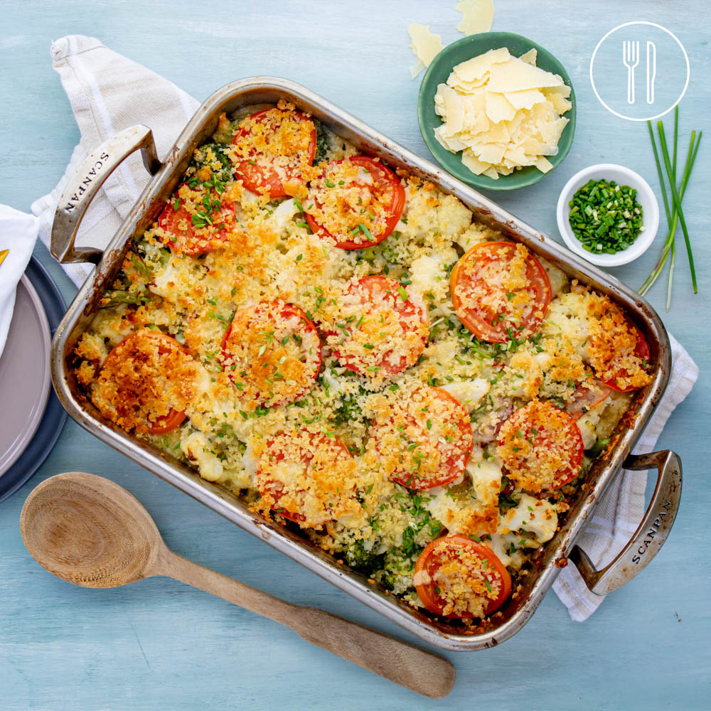 Tender cauliflower and broccoli, baked in a creamy parmesan cheese sauce with crispy prosciutto, crispy golden panko crumb topping and garnished with fresh chives.