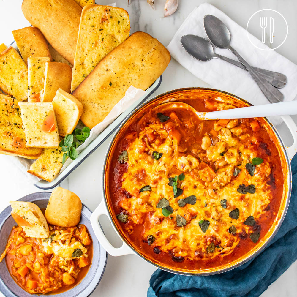This veggie-packed bean bake is warming and wholesome! Plus, it’s topped with shredded cheese and baked to melted cheesy perfection, then served with herby, tomato-rubbed focaccia rolls!