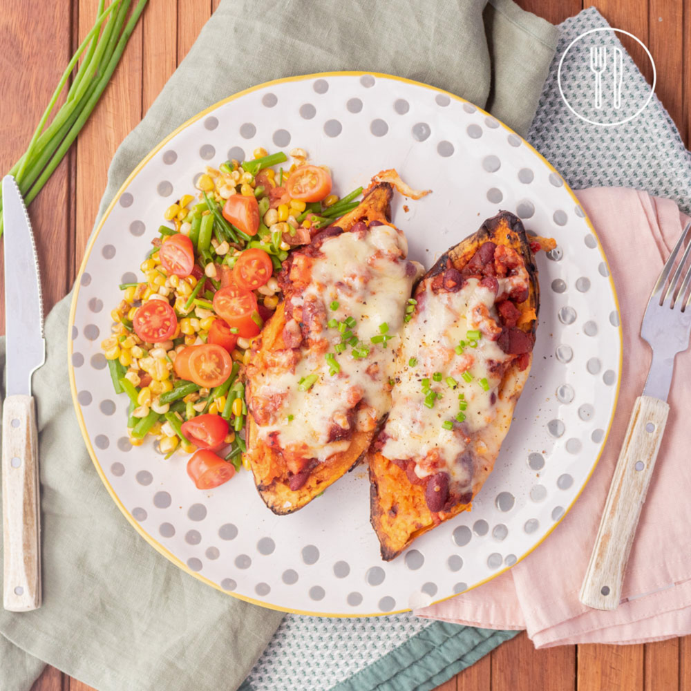 Golden sweet potato boats filled with a tasty bacon and bean stuffing and topped with melty cheese, served alongside a charred corn salsa.