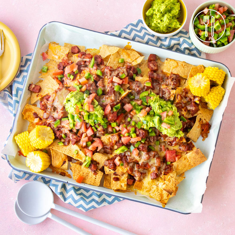 Tortilla chips topped with tasty Mexican spiced chorizo sauce and cheese, baked in the oven until bubbly. Topped with creamy avocado and a fresh diced salsa.