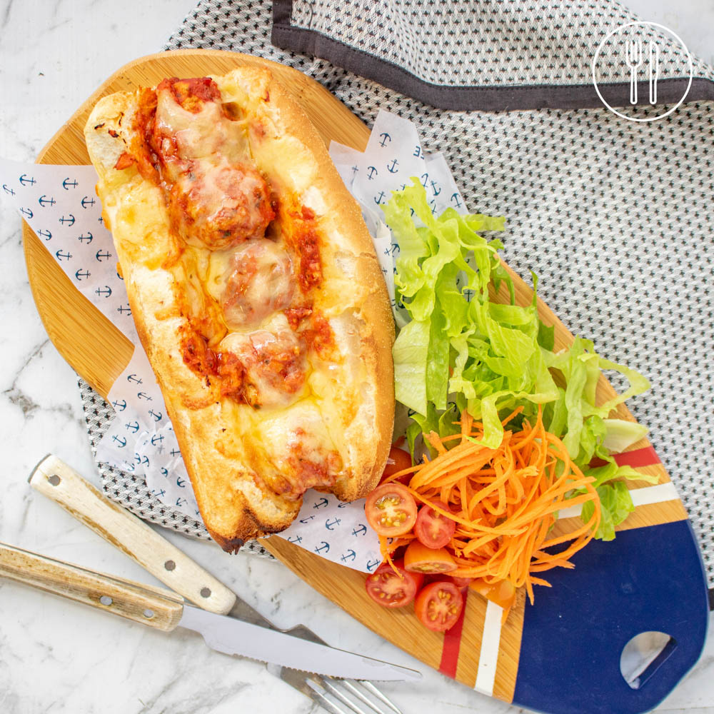Crusty bread rolls filled with pork meatballs in a tomato sugo and topped with melty cheddar cheese, accompanied by fresh salad fillings.