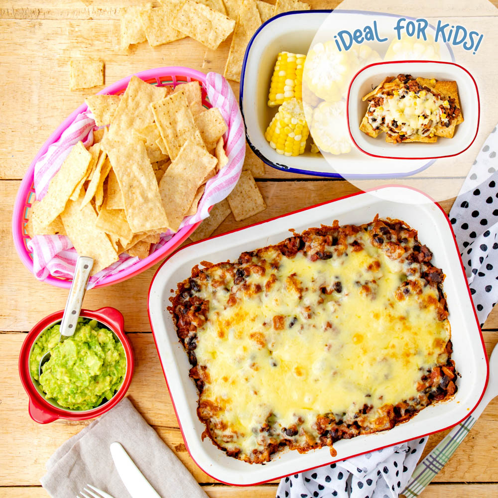 A classic taco-style beef sauce finished with cheese in the oven served with tortilla strips and mashed avo for dipping.