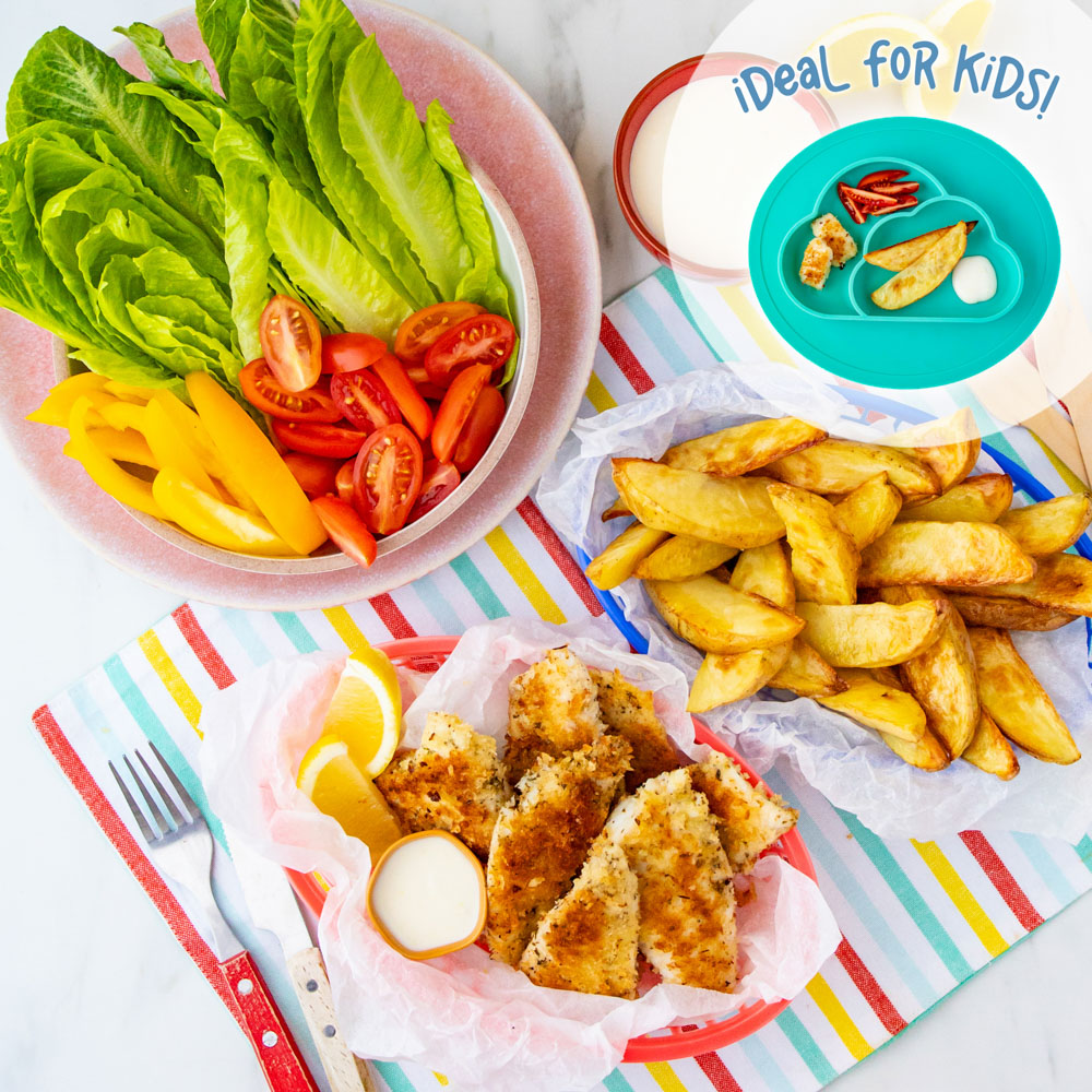 Crunchy panko chicken bites served with golden wedges, salad and a fresh lemon aioli for dipping.