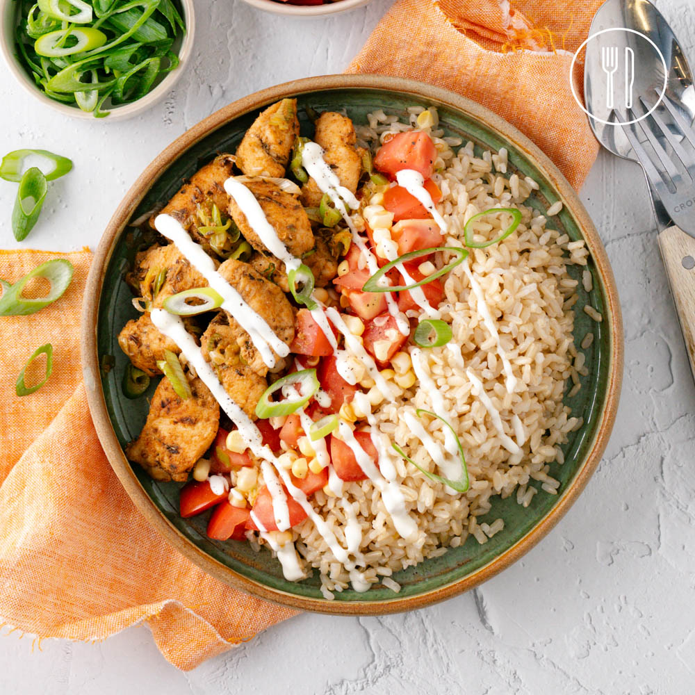 Tender spiced chicken served over hearty brown rice with fresh corn, tomato, and spring onions, finished with a cooling yoghurt topping.